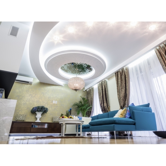 Trần uốn lượn rất phù hợp với các hệ đèn LED hắt sáng hoặc đèn âm trần. Ánh sáng chạy theo đường cong giúp: